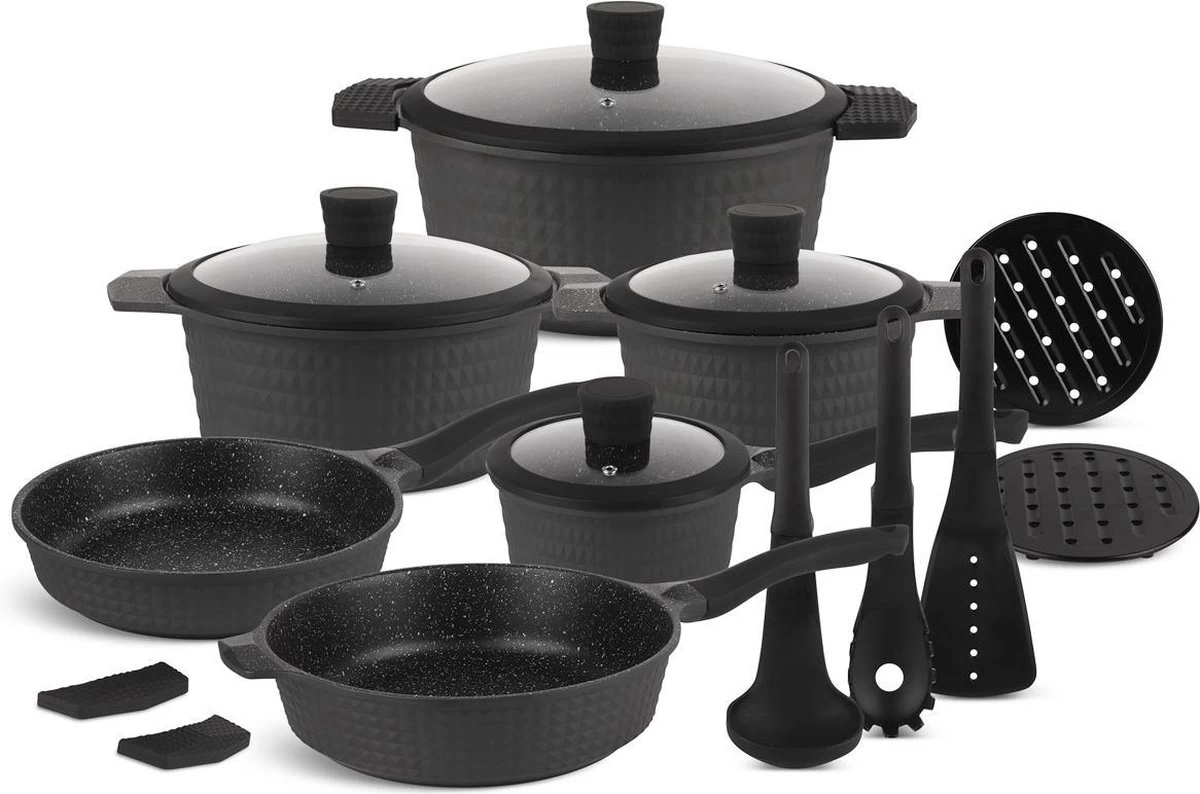 De uitgebreide set is ideaal voor de starter maar ook voor de ervaren kok ter vervanging of aanvulling van de huidige pannen. Of je nu voor iedereen een visje wilt grillen op de plaat, een stukje vlees wilt bakken in de pannen, een verse saus bereiden of de groenten koken: het kan allemaal op een gemakkelijk wijze zonder aankoeken en moeilijk schoonmaken.