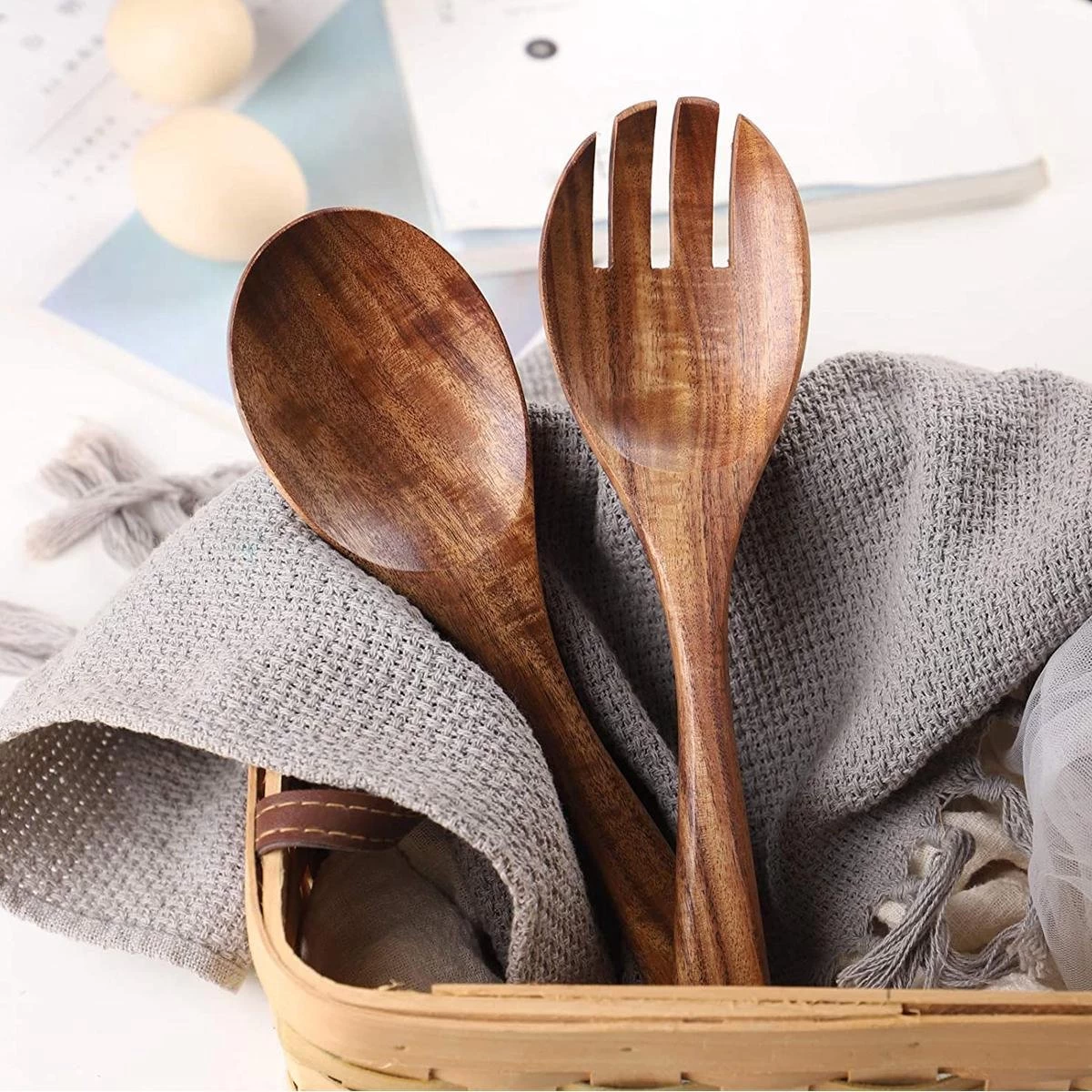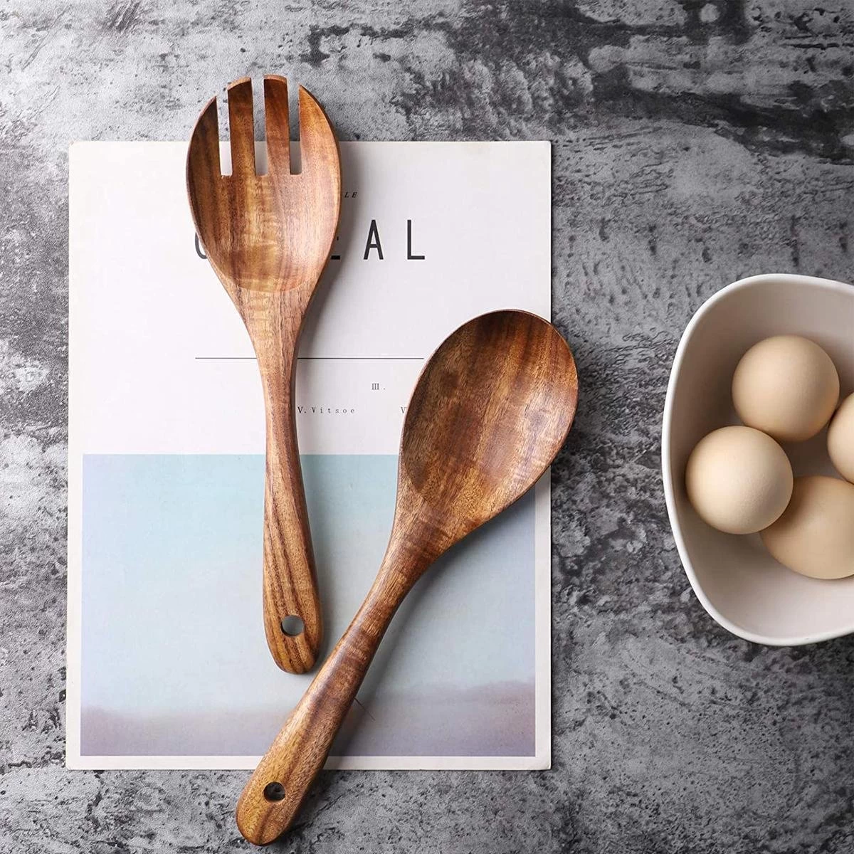 Schep jouw salade op met het natuurlijke Slabestek. Het houten bestek staat mooi in elke keuken.