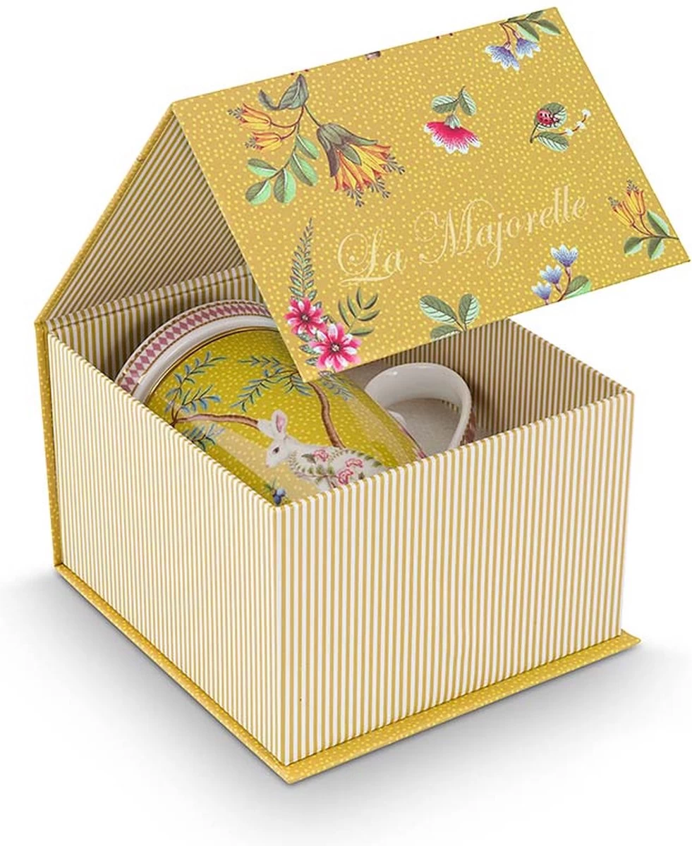 Een gele theeset bestaande uit een mok + theezeefje + theetip. De set is verpakt in een bijpassende doosje.