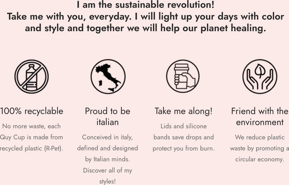 Quy Cup Espresso cups are environmentally friendly because they can be recycled indefinitely: this means fighting together against the waste of disposable products.