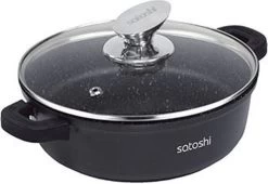 De Satoshi hapjes pan gemaakt van giet aluminium heeft een diameter van 40 cm. De pan is voorzien van een anti-aanbaklaag zonder PFOA. De pan wordt geleverd met silicone handvatten die warmte vast zijn tot 220 graden. Geschikt voor alle warmtebronnen en gebruik in de oven.